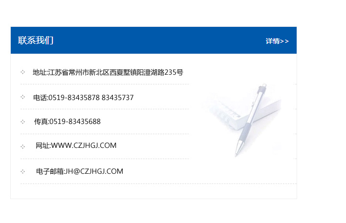 地址:常州市新北區友邦商務大廈1幢16、17層  電話:0519-85101652  傳真:0519-85112595  郵編:213022  網址:www_cz-jiayue_cn.zhanglidaoyan.com  郵箱:xiajifengaa@163.com